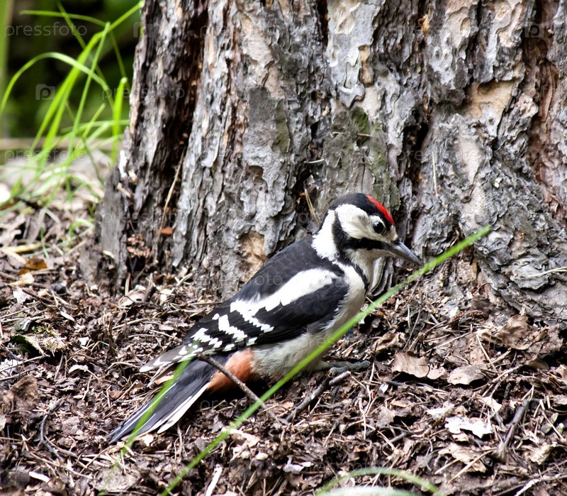 Дятел ищет пищу в сухих листьях