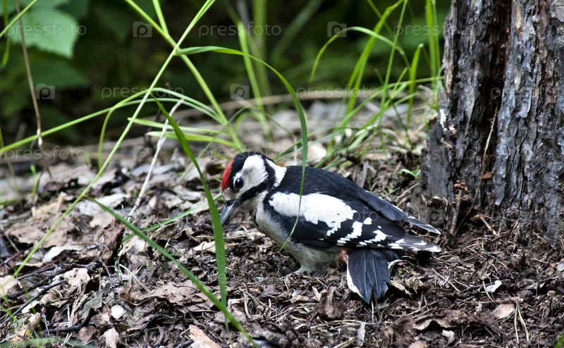 Дятел ищет пищу в сухих листьях