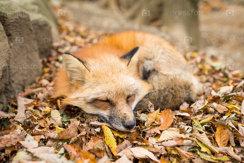 Лиса спит на листьях