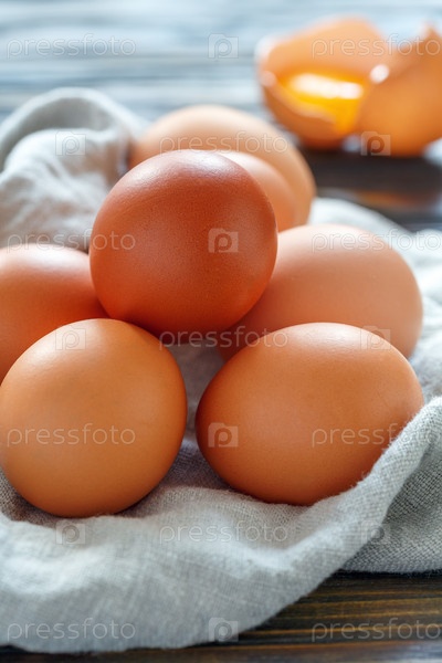 Куриные яйца и сломанная яичная скорлупа с желтком