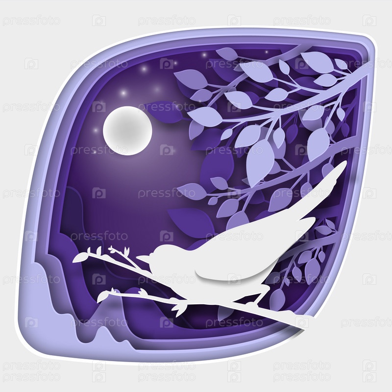 Искусство вырезания из бумаги: птицы на ветке дерева в лесу