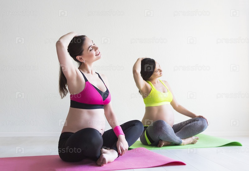 Две молодые беременные женщины делают упражнения йоги