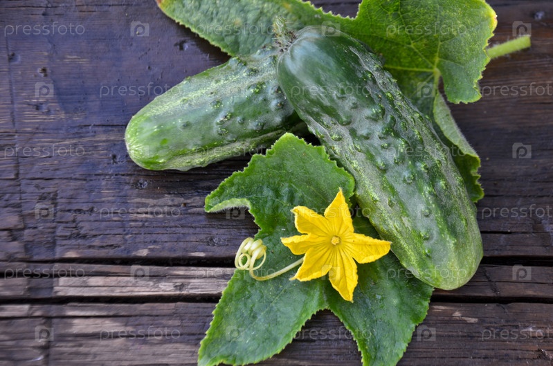 Огурцы с листьями и цветком на деревянной доске