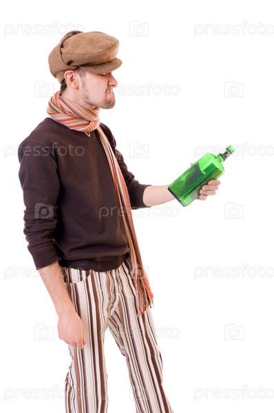 Молодой человек с зеленой бутылкой на белом фоне