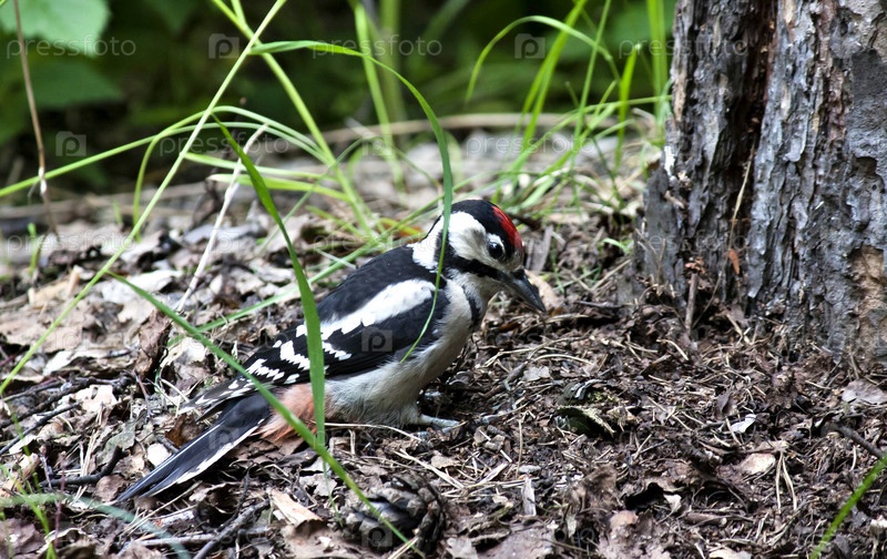 Дятел ищет пищу в сухих листьях