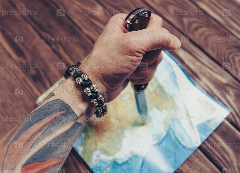 Рука с ножом, указывая на карту