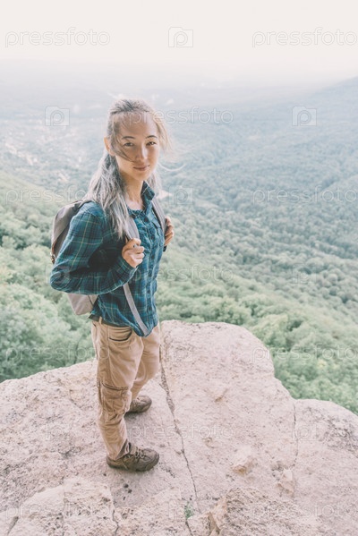Путешественница с рюкзак, стоя на высокой скале