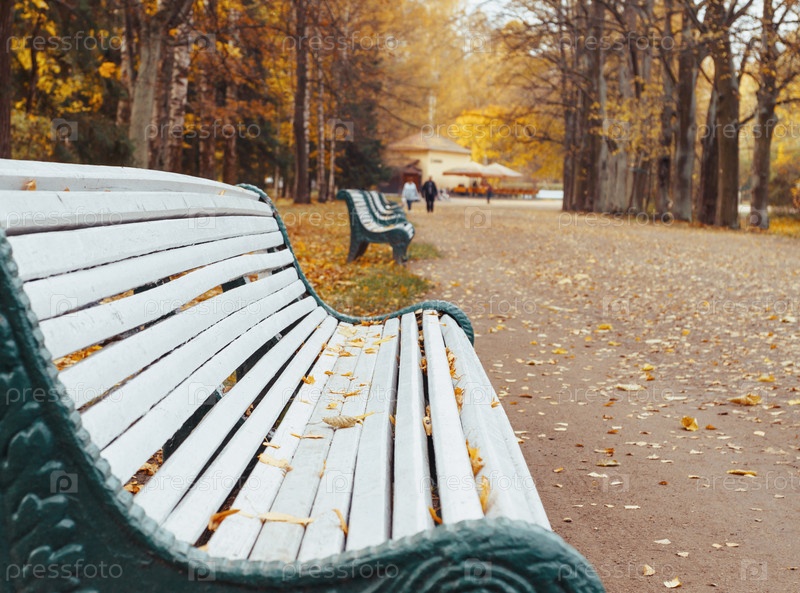 Деревянные скамейки в парке осенью