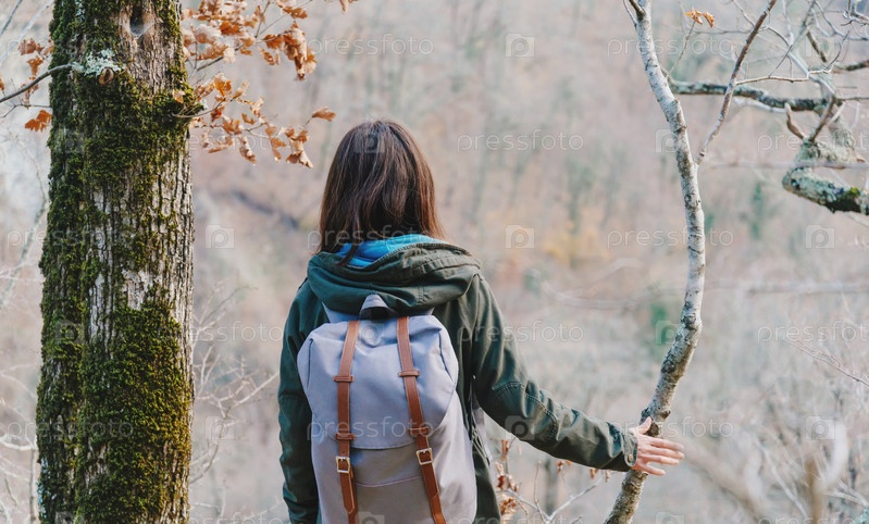 Женщина-путешественник в осеннем лесу