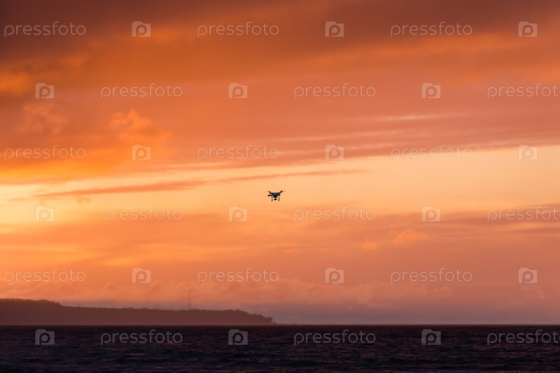 Летающий дрон над морем и облака