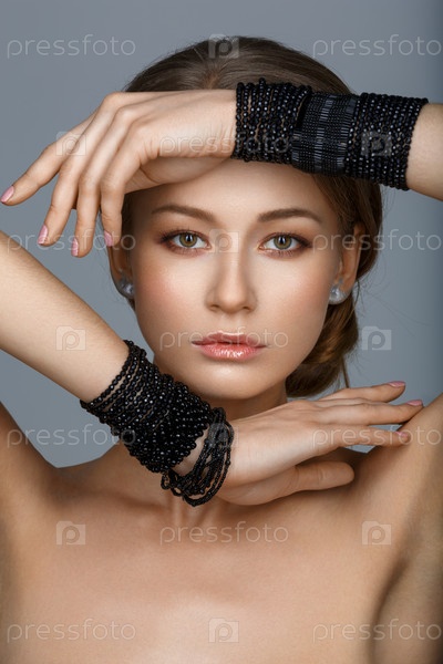 Красивая девушка с большим количеством черных браслетов