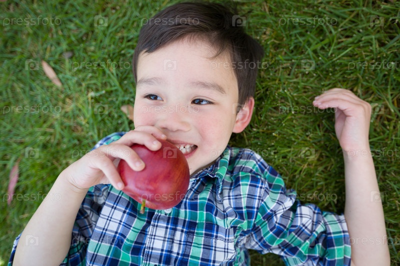 Мальчик с яблоком на траве