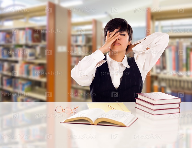 Студент в библиотеке с пустым листом бумаги и книгами