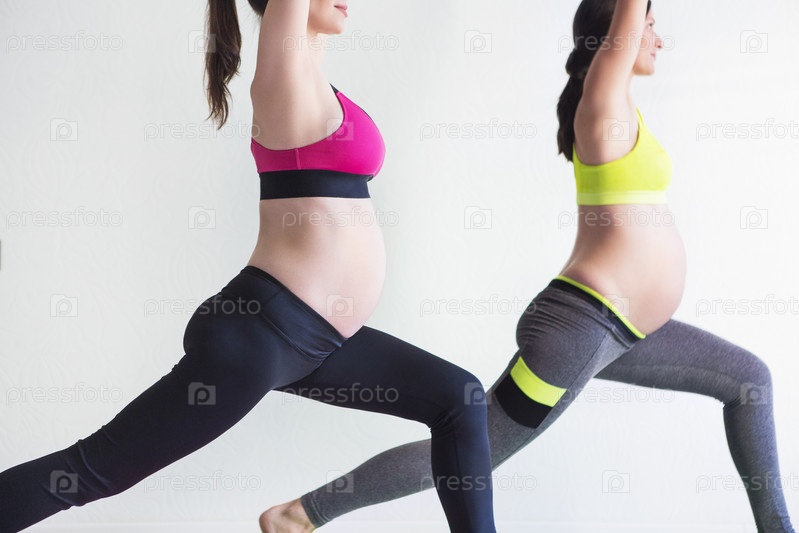 Две молодые беременные женщины делают упражнения фитнеса