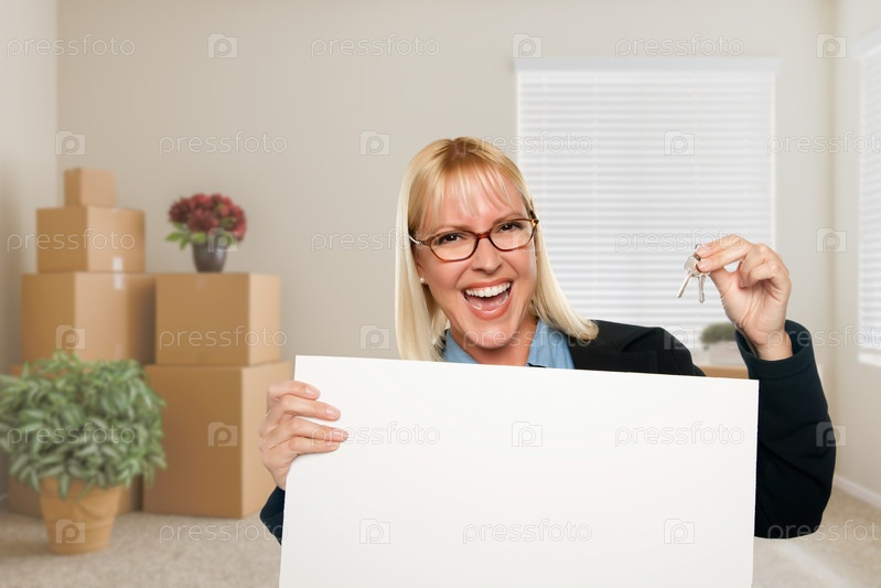 Женщина с пустым плакатом и ключами от дома