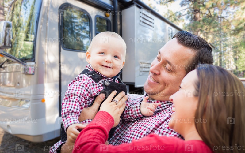 Счастливая молодая семья в палаточном лагере