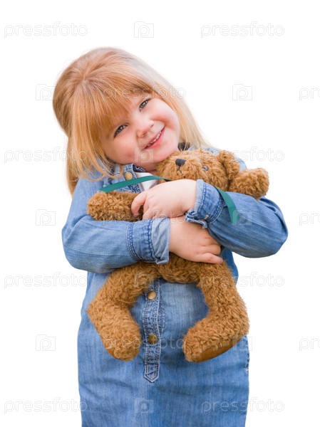 Симпатичная маленькая девочка и плюшевый мишка на белом фоне