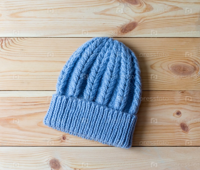 Синяя шапка из шерсти на деревянном фоне