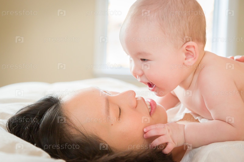 Малыш, лежа в постели с его матерью