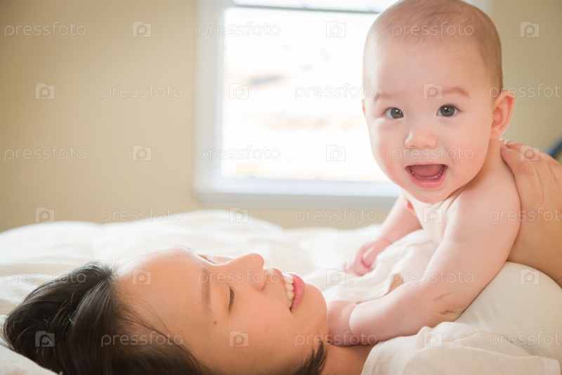 Малыш, лежа в постели с его матерью