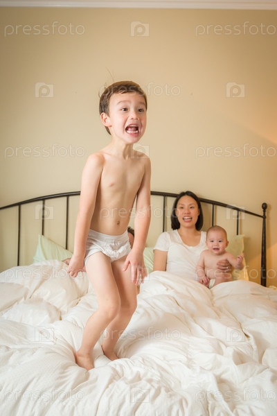 Мальчик прыгает в кровати с его семьей