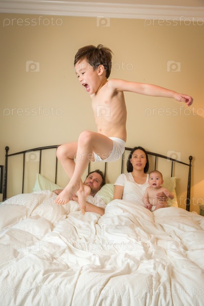 Мальчик прыгает в кровати с его семьей