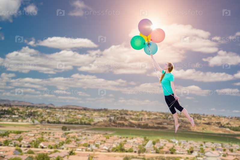 Молодая девушка летит на воздушных шарах