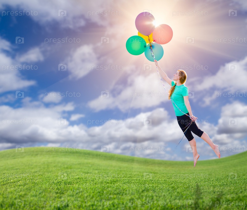 Молодая девушка летит на воздушных шарах