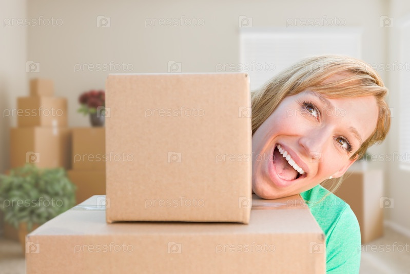 Женщина с коробками в пустой комнате