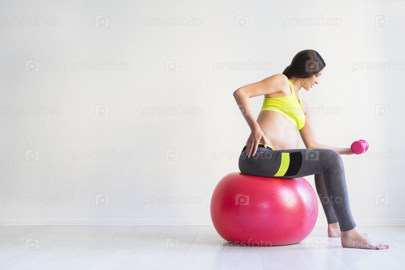 Молодая беременная женщина делает упражнения по фитнесу