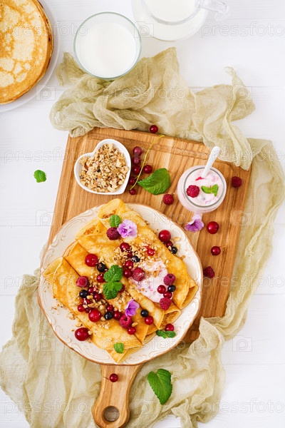 Блины с йогуртом, медом, орехами и летними ягодами. Вкусный завтрак