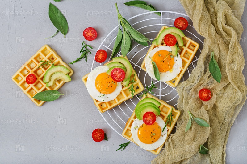 Здоровый завтрак - вафли, яйца, авокадо, помидоры и зелень