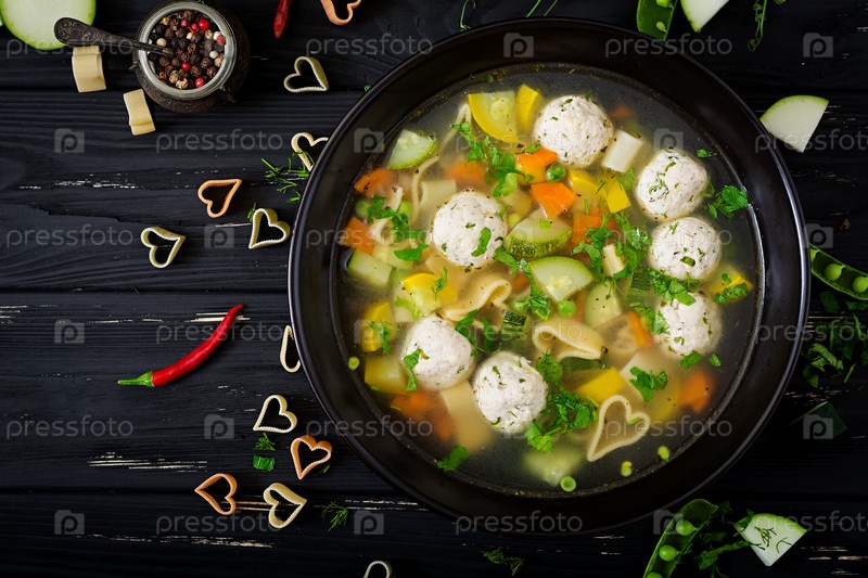 Куриный овощной суп с фрикадельками, цукини и макаронами