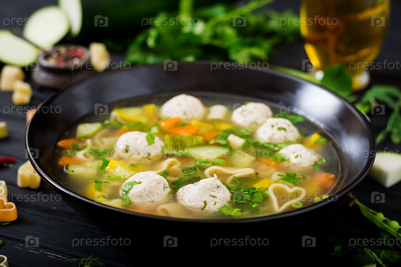 Куриный овощной суп с фрикадельками, цукини и макаронами