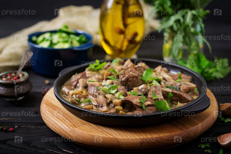 Бефстроганов из куриной печени с грибами и сливками