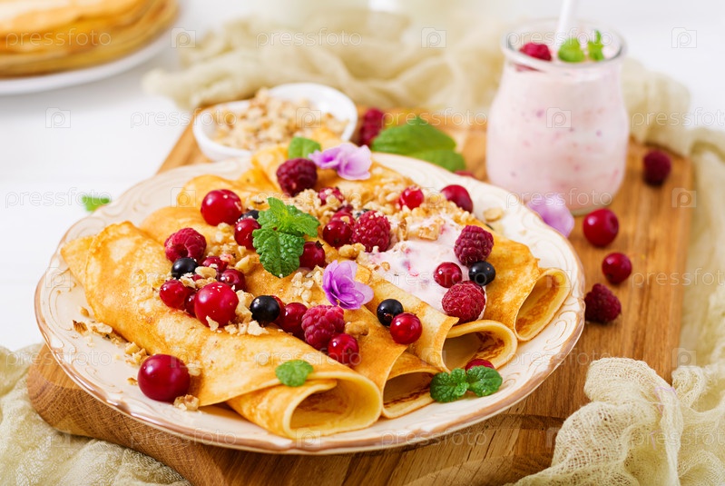 Блины с йогуртом, медом, орехами и летними ягодами. Вкусный завтрак