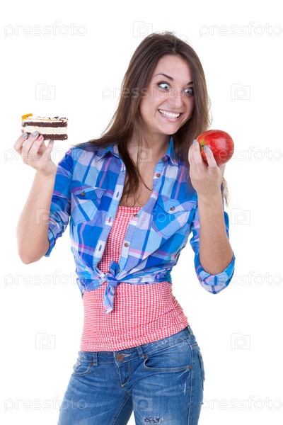 Девушка выбирает между пирожным и яблоком. Изолировано на белом фоне