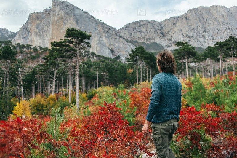 Путешественник в осеннем лесу на горе