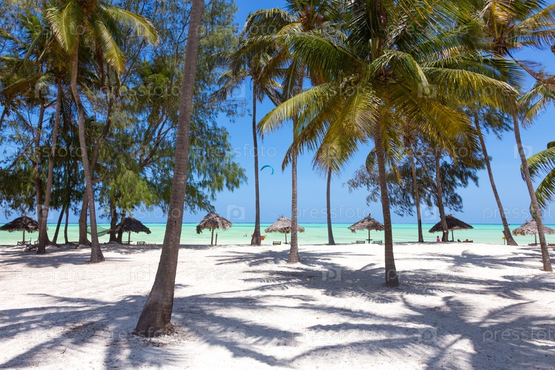Идеальный белый песчаный пляж с пальмами, Занзибар, Танзания