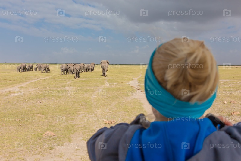 Женщина смотрит на стадо слонов на африканском сафари