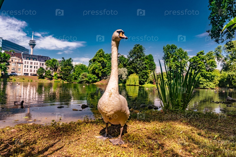 Белый лебедь на земле возле озера