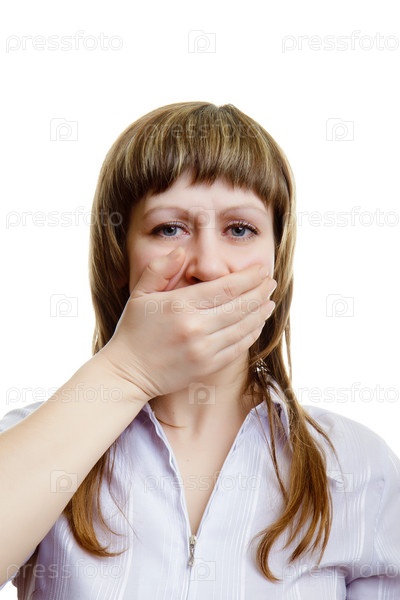 Молодая женщина закрыла рот рукой, белый фон