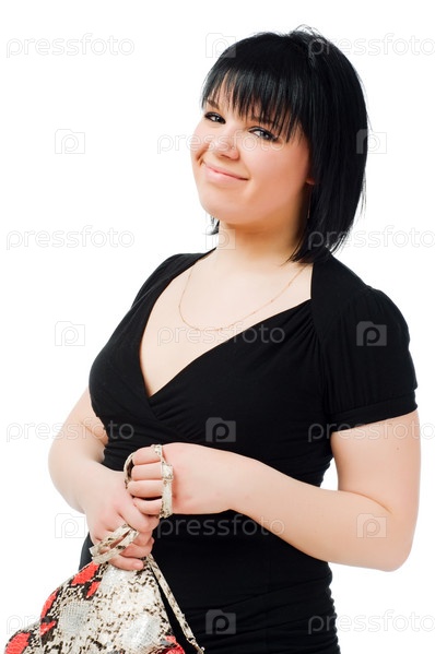 Молодая женщина с сумочкой на белом фоне