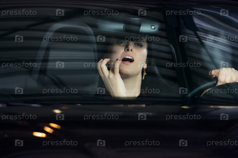 Красивая молодая женщина прихорашивается за рулем автомобиля