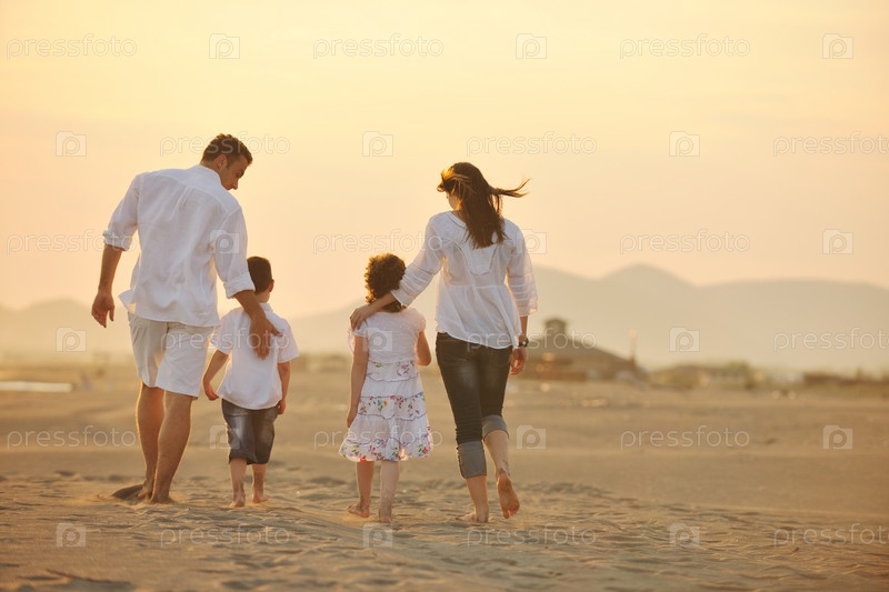 Счастливая молодая семья на пляже