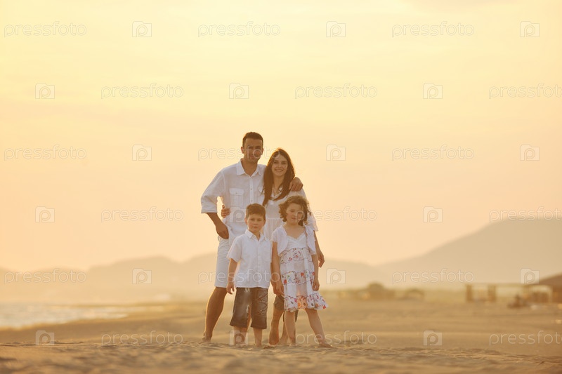Счастливая молодая семья на пляже