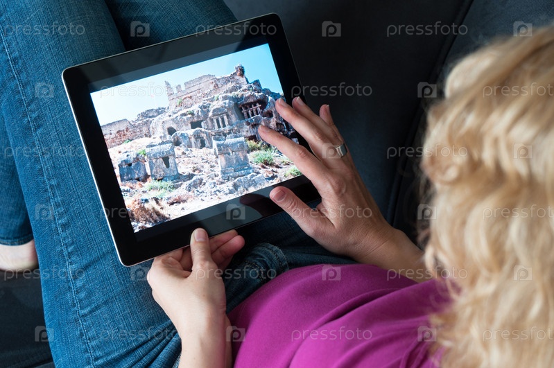 Женщина с планшетным компьютером на диване