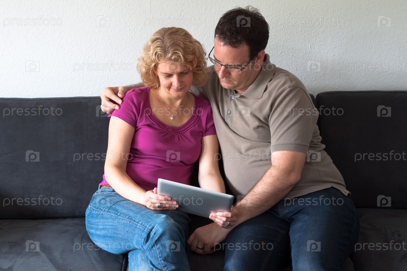 Пара сидит на диване с планшетным комптютером