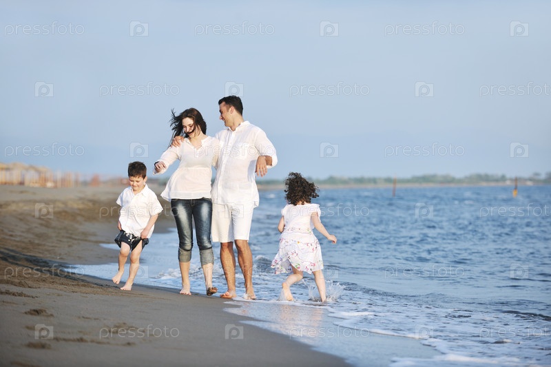 Счастливая молодая семья на пляже