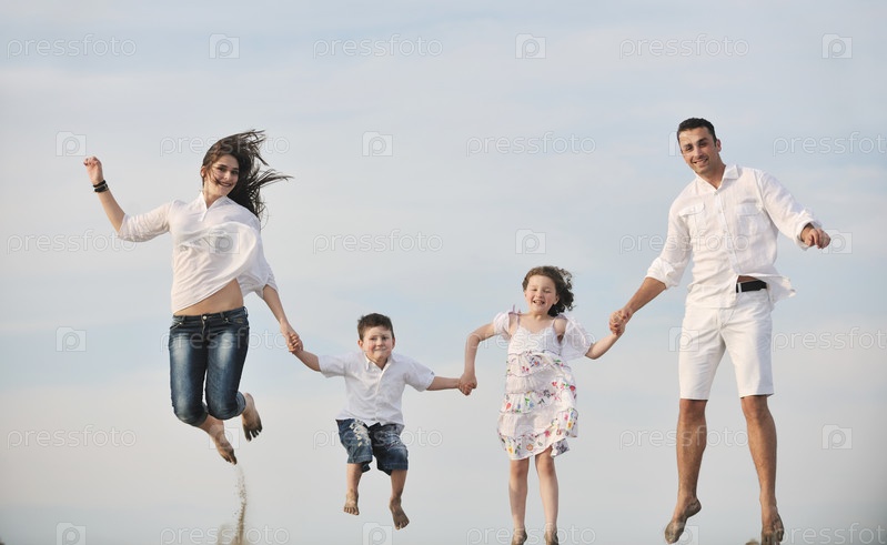 Счастливая молодая семья на пляже
